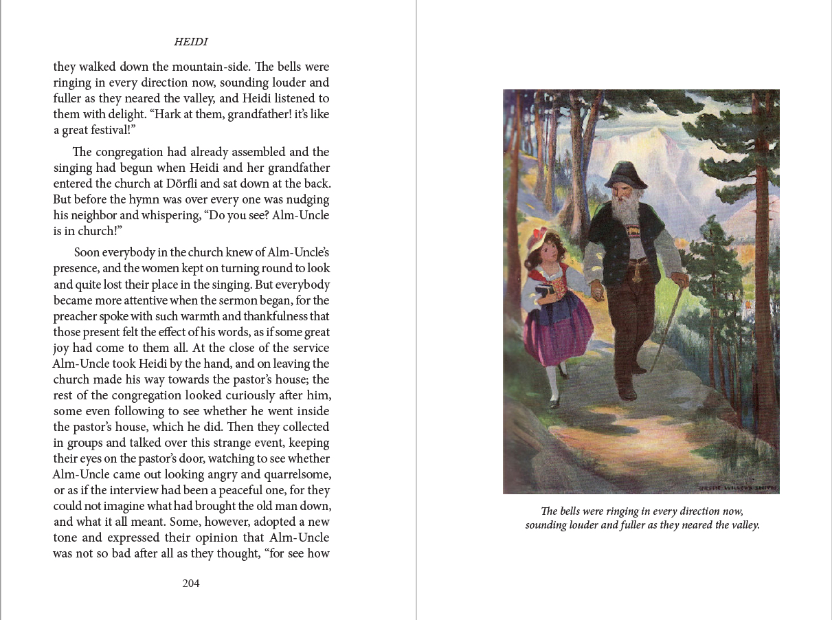 Description: The well-loved tale of Heidi, the young Swiss mountain girl, whose joyous nature transforms the lives of all those around her. Brought as an orphan to the Alm Uncle's rude Alpine hut, Heidi soon softens his heart and comes to delight in gamboling on the mountainside with Peter and his goats. But her aunt procures for her a position as companion to the ailing Clara, so she reluctantly leaves behind her primitive life and sweeps, like a breath of fresh air, into the sophisticated city home. Her love for the Alpine pastures is so strong, however, that she grows ill herself for want of the bracing mountain air. On her return home, she brings joy to the Alm Uncle and the grandmother and quickly regains her vitality.