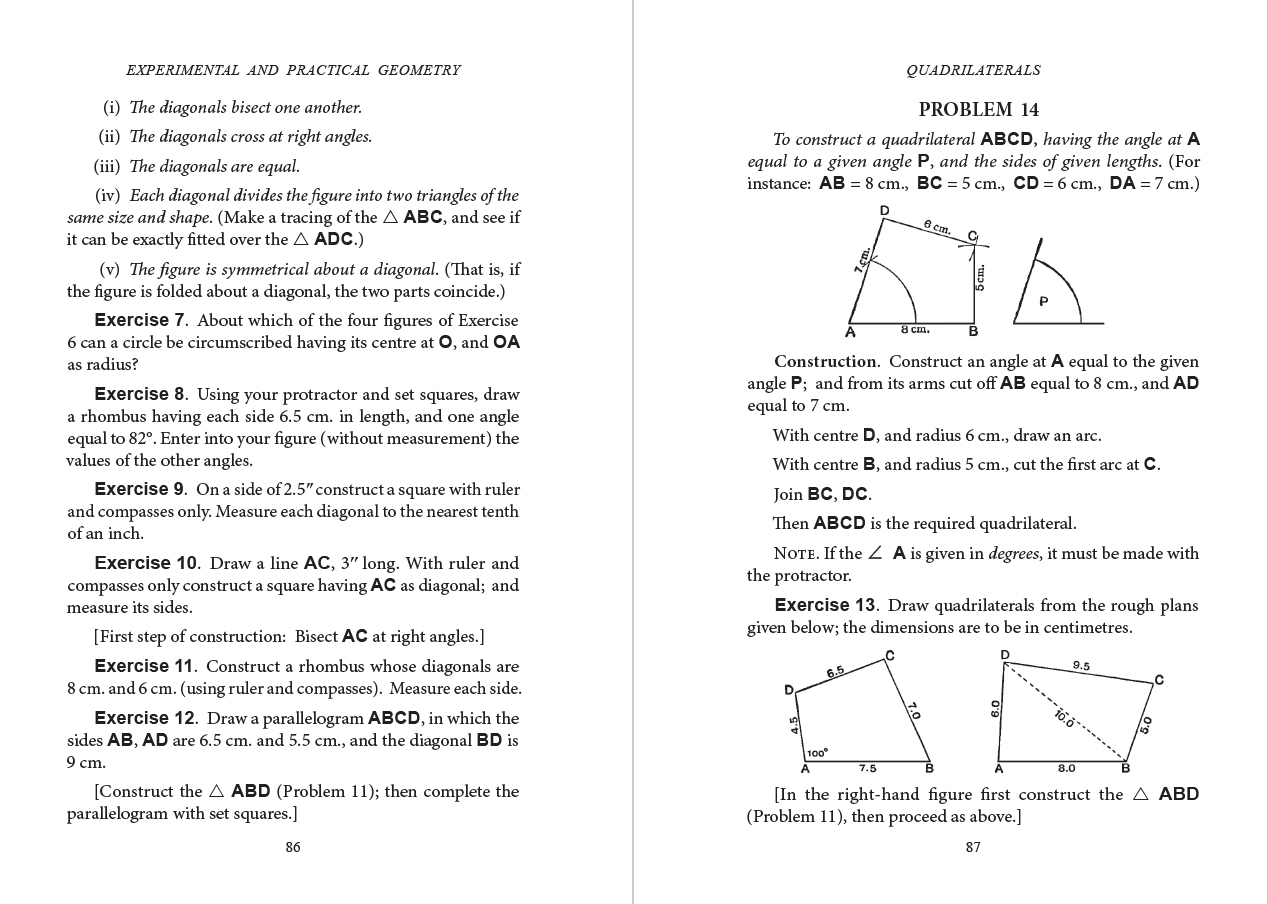Description: A short preliminary course of practical and experimental work in geometry to give the beginning student clear mental pictures of geometric objects and constructions. Early chapters introduce easy exercises in drawing to illustrate definitions, measurement of lines and angles, and the use of compasses and protractor. Next come problems on bisection, parallels, and perpendiculars, followed by the use of set squares and the construction of triangles and quadrilaterals. Problems are explained informally, with the results verified by measurement.
