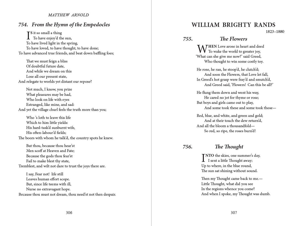 This volume includes 376 poems by 128 different poets, arranged in order by the year of their birth. As you might imagine, the Romantic poets are well-represented in the collection, as are the Victorians. There are also many fine poems from less familiar poets for the reader to discover. Most of the poems were penned by British poets, with a handful from American authors.